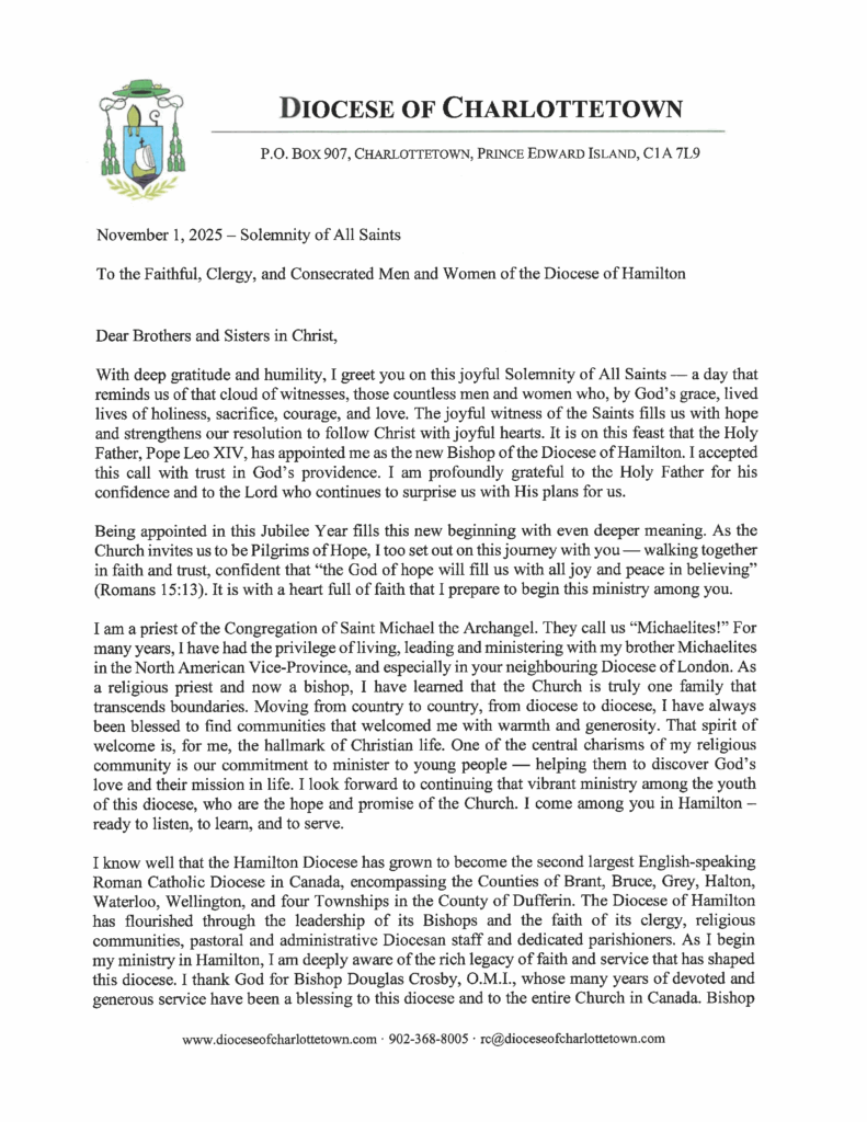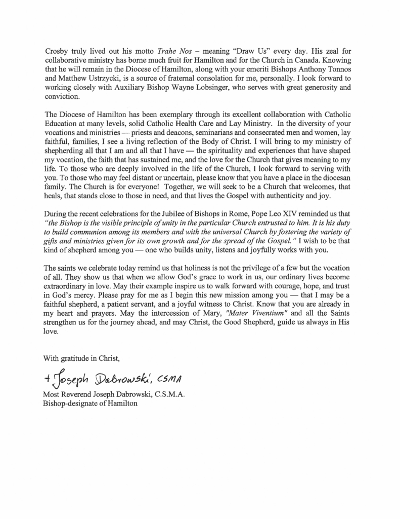 Letter from His Excellency, Bishop Joseph Dabrowski, C.S.M.A. Published November 03, 2025 / by St. Lawrence Hamilton Posted In Uncategorized